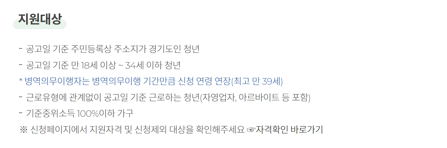 현재 공고일 2023년 5월 12일 기준으로 만 18세 이상~ 34세 이하 청년에게 신청 자격이 주어지는 대상자 입니다. 여기서 병역 의무자는 최고 만 39세까지 가능하겠습니다.