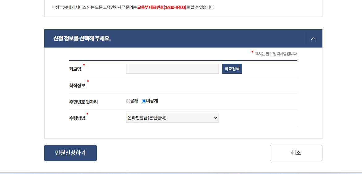 회원 인증을 하여 로그인을 하게 되면 위에 보이는 화면이 나오는데요. 유치원부터 고등학교 생활기록부를 조회할수 있다고 합니다. 하지만 저는 초등학교 생활기록부는 조회가 되지 않는데요. 연령에 따라 20대 30대 40대 등 조회 가능한 차이가 있으니 꼭 참고 해주세요.